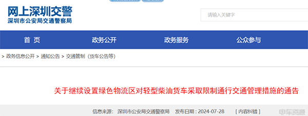 2024年7月28日,深圳市公安局交通警察局發(fā)布了關(guān)于繼續(xù)設(shè)置綠色物流區(qū)對輕型柴油貨車采取限制通行交通管理措施的通告。通告指出:自2024年7月29日至2025年7月28日,每天0時至24時,禁止輕型柴油貨車駛?cè)?ldquo;綠色物流區(qū)”。凡違反本通告規(guī)定的,將依照道路交通管理法律法規(guī)和相關(guān)規(guī)定予以處罰。