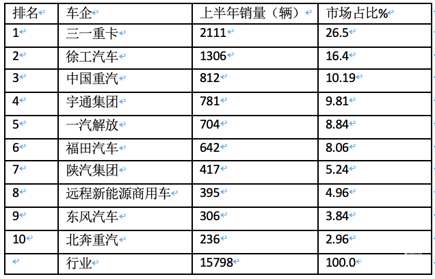 ---三一重卡累計(jì)銷售829輛,是唯二累計(jì)銷量超越800輛的車企,市場(chǎng)占比24.1%,穩(wěn)居第二;