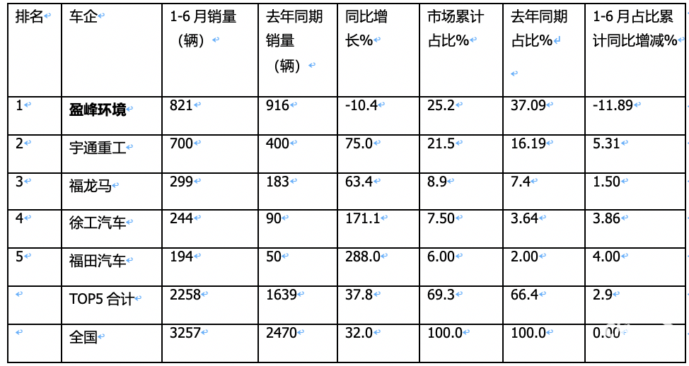 上圖表可見,在今年1-6月新能源環(huán)衛(wèi)車銷量中,盈峰環(huán)境、宇通重工、福龍馬居TOP3;