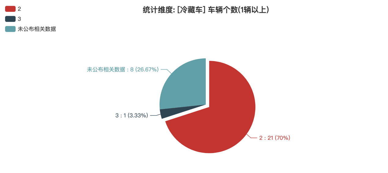 本次公告中的30款冷藏車中,車型軸數(shù)情況如下:2軸(21輛,占比70%)、3軸(1輛,占比3.33%)、未公布相關(guān)數(shù)據(jù)(8輛,占比26.67%)。