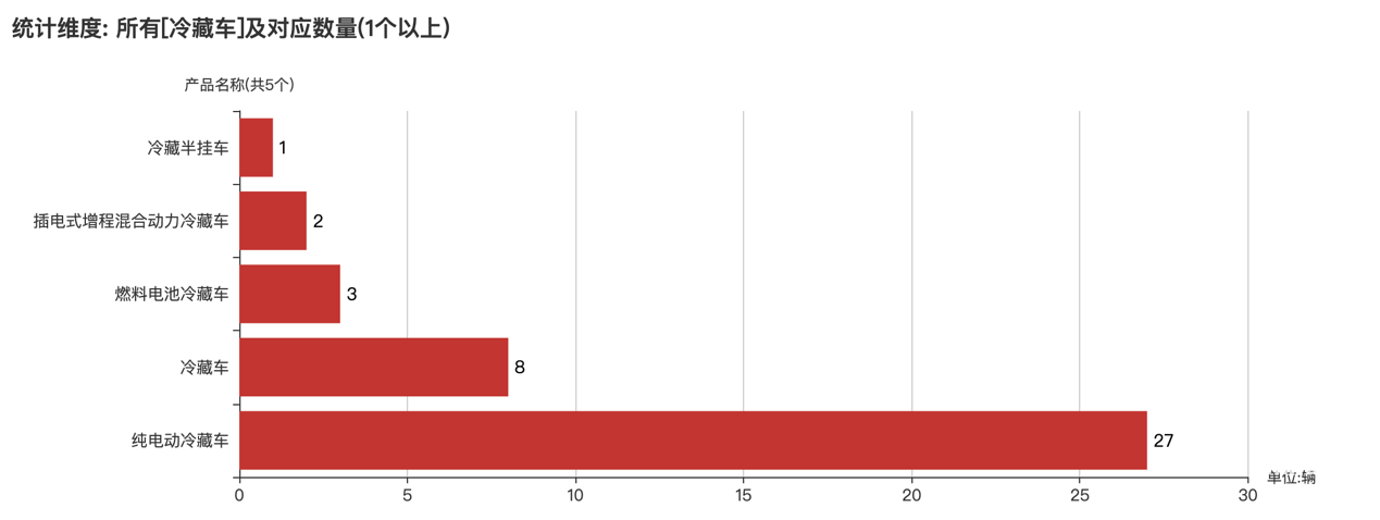 本次公告中的41款冷藏車的車型共有5種,純電動冷藏車(27輛)、冷藏車(8輛)、燃料電池冷藏車(3輛)、插電式增程混合動力冷藏車(2輛)、冷藏半掛車(1輛)。