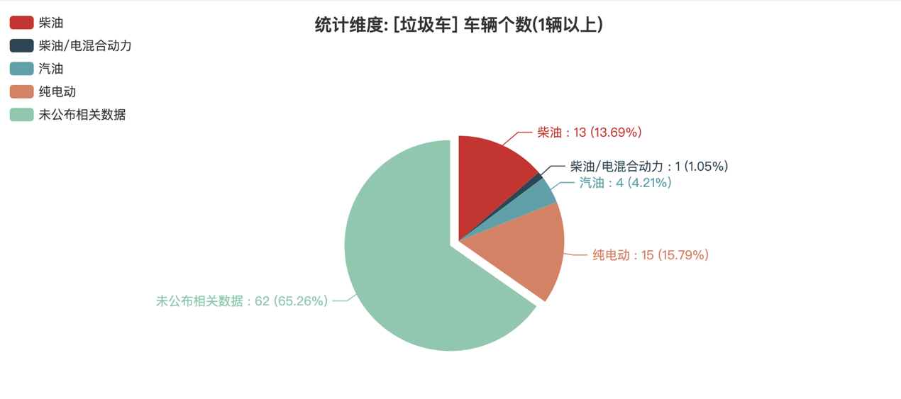 本次公告中的95款垃圾車中,柴油(13輛,占比13.68%)、柴油/電混合動力(1輛,占比1.05%)、汽油(4輛,占比4.21%)、純電動(15輛,占比15.79%)、未公布相關(guān)數(shù)據(jù)(62輛,占比65.26%)。