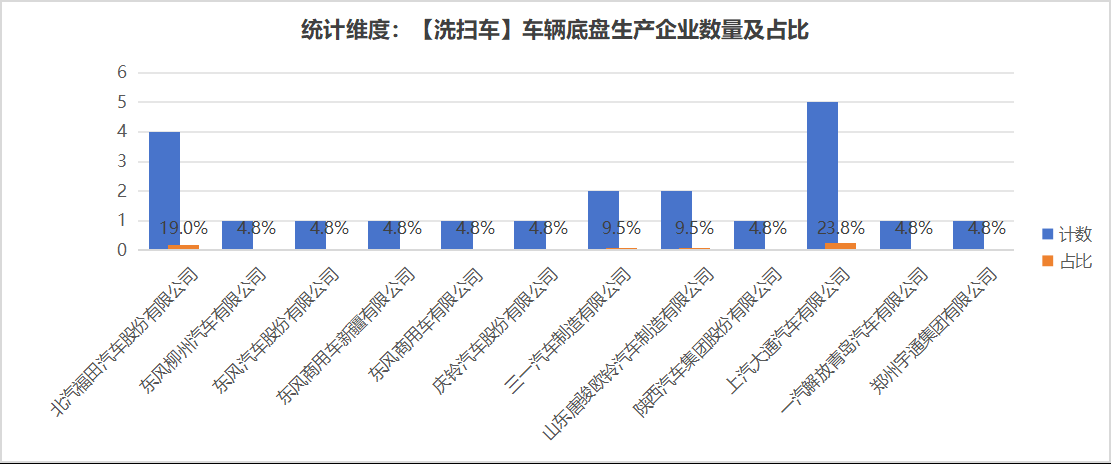 本次公告中的21款洗掃車的底盤生產(chǎn)企業(yè)共有12家,北汽福田汽車股份有限公司(4輛,占比19.0%)、東風柳州汽車有限公司(1輛,占比4.8%)、東風汽車股份有限公司(1輛,占比4.8%)、東風商用車新疆有限公司(1輛,占比4.8%)、東風商用車有限公司(1輛,占比4.8%)、慶鈴汽車股份有限公司(1輛,占比4.8%)、三一汽車制造有限公司(2輛,占比9.5%)、山東唐駿歐鈴汽車制造有限公司(2輛,占比9.5%)、陜西汽車集團股份有限公司(1輛,占比4.8%)、上汽大通汽車有限公司(5輛,占比23.8%)、一汽解放青島汽車有限公司(1輛,占比4.8%)、鄭州宇通集團有限公司(1輛,占比4.8%)。本次公告中的21款洗掃車中,均采用二類底盤。