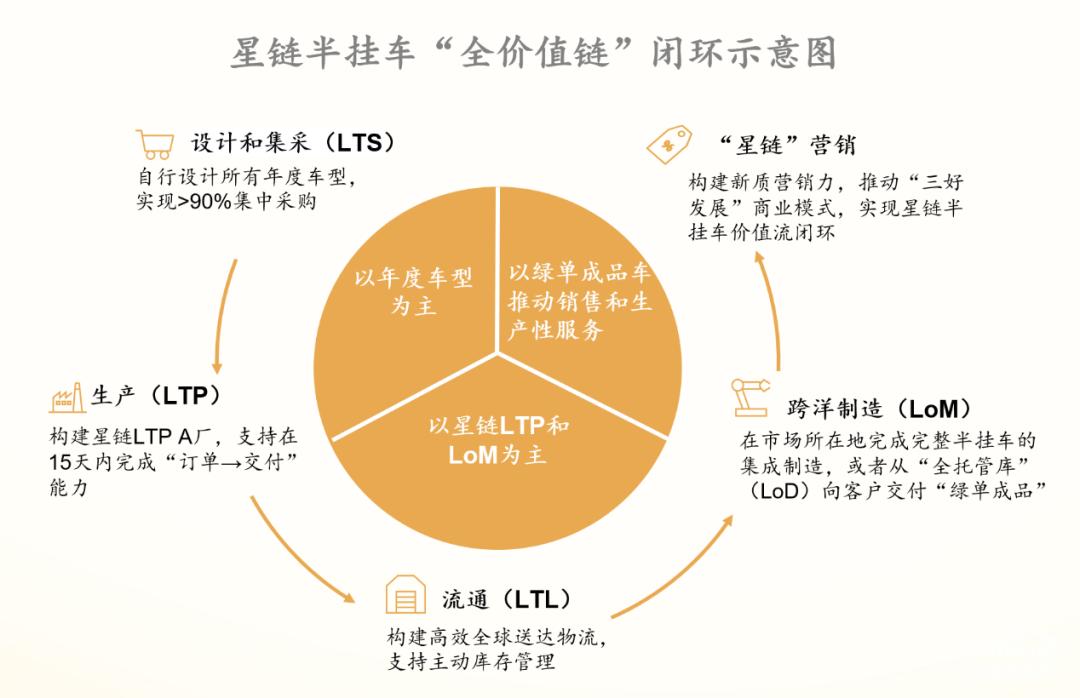 值得一提的是,為應(yīng)對全球地緣政治的各種漩渦,并提升長遠的競爭力,中集車輛有五大核心舉措,其中全球半掛車以“星鏈計劃”和“雄起計劃”為抓手,深度挖掘全價值鏈各個環(huán)節(jié)的價值是首要舉措。“星鏈計劃”精心定義半掛車業(yè)務(wù)全價值鏈的五個核心環(huán)節(jié),推動公司實現(xiàn)星鏈半掛車“全價值鏈”的價值流閉環(huán)。