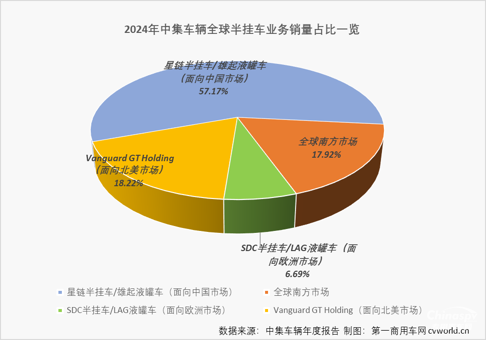 2024年,中集車輛共生產(chǎn)和制造了10.17萬臺各類半掛車,包括面向中國市場的5.81萬臺星鏈半掛車/雄起液罐車、銷往全球南方市場的1.82萬臺各類半掛車、面向歐洲市場的6808臺SDC半掛車/LAG液罐車,以及面向北美市場的1.85萬臺Vanguard GT Holding。其中,中集車輛2024年國內(nèi)半掛車整體銷量同比上升12%,市占率達14.04%,連續(xù)六年保持全國第一。