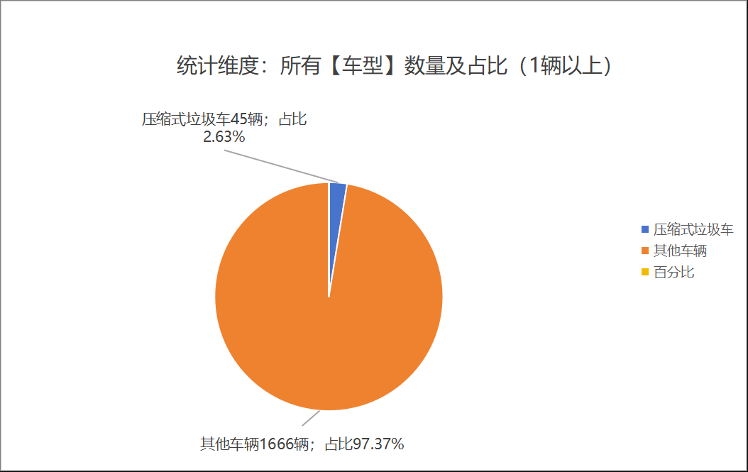 本次公告中的45款壓縮式垃圾車中底盤生產(chǎn)企業(yè)共計18家,其中:安徽江淮汽車集團股份有限公司(2輛,占比4.4%)、北京福田戴姆勒汽車有限公司(1輛,占比2.2%)、北汽福田汽車股份有限公司(5輛,占比11.1%)、程力汽車集團股份有限公司(1輛,占比2.2%)、東風汽車股份有限公司(6輛,占比13.3%)、東風汽車集團有限公司(4輛,占比8.9%)、東風商用車新疆有限公司(2輛,占比4.4%)、東風商用車有限公司(2輛,占比4.4%)、江鈴汽車股份有限公司(1輛,占比2.2%)、江西吉利新能源商用車有限公司(1輛,占比2.2%)、陜西汽車集團股份有限公司(4輛,占比8.9%)、上汽大通汽車有限公司(4輛,占比8.9%)、浙江飛碟汽車制造有限公司(1輛,占比2.2%)、鄭州宇通集團有限公司(1輛,占比2.2%)、中國第一汽車集團有限公司(2輛,占比4.4%)、中國重汽集團成都王牌商用車有限公司(1輛,占比2.2%)、中國重汽集團福建海西汽車有限公司(3輛,占比6.7%)、中國重汽集團濟南卡車股份有限公司(4輛,占比8.9%)。