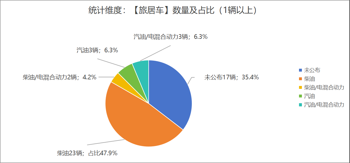 本次公告中的48款旅居車(chē)中,柴油(23輛,占比47.9%)、汽油(3輛,占比6.3%)、汽油/電混合動(dòng)力(3輛,占比6.3%)、柴油/電混合動(dòng)力(2輛,占比4.2%)、未公布相關(guān)數(shù)據(jù)(17輛,占比35.4%)。
