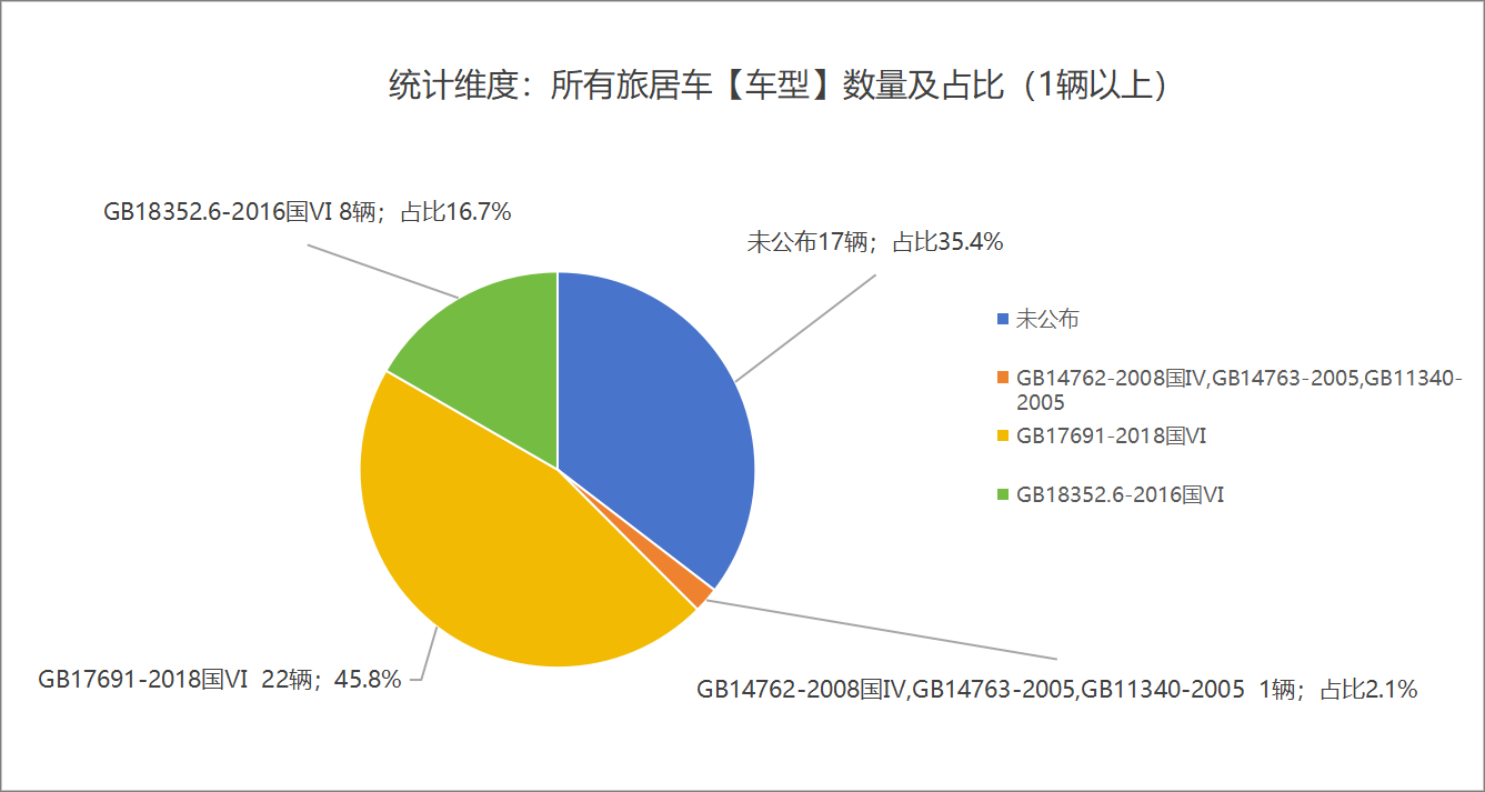 本次公告中的48款旅居車(chē)中,GB14762-2008國(guó)Ⅳ,GB14763-2005,GB11340-2005(1輛,占比2.1%)、GB17691-2018國(guó)Ⅵ(22輛,占比45.8%)、GB18352.6-2016國(guó)Ⅵ(8輛,占比16.7%)、未公布相關(guān)數(shù)據(jù)(17輛,占比35.4%)。