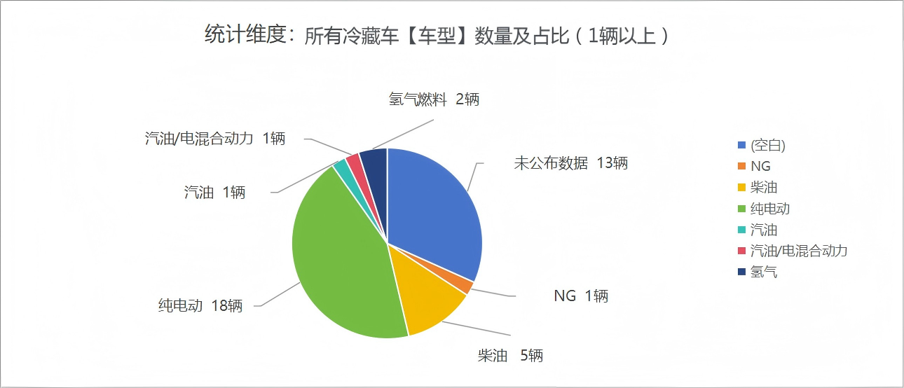 本次公告中的41款冷藏車中,燃料選擇采用柴油的(20輛)、采用NG的(1輛)、采用純電能源的(18輛)、采用汽油的(1輛)、采用汽油/電混合動力的(1輛)、采用氫氣的(1輛)、未公布能源情況(13輛)。
