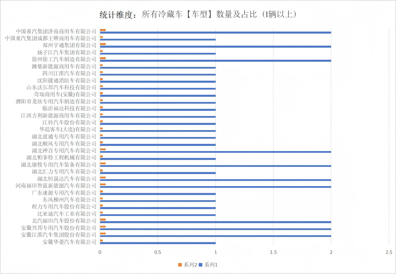 本次公告中的22款冷藏車的底盤生產(chǎn)企業(yè)共有25家,安徽華菱汽車有限公司(1輛)、安徽江淮汽車集團股份有限公司(2輛)、北京福田戴姆勒汽車有限公司(2輛)、北汽福田汽車股份有限公司(4輛)、比亞迪汽車工業(yè)有限公司(2輛)、東風(fēng)柳州汽車有限公司(1輛)、東風(fēng)商用車有限公司(1輛)、廣西汽車集團有限公司(1輛)、河南福田智藍(lán)新能源汽車有限公司(2輛)、江鈴汽車股份有限公司(2輛)、江西吉利新能源商用車有限公司(1輛)、南京汽車集團有限公司(1輛)、奇瑞商用車(安徽)有限公司(1輛)、慶鈴汽車股份有限公司(1輛)、山東唐駿歐鈴汽車制造有限公司(2輛)、上汽通用五菱汽車股份有限公司(1輛)、四川江淮汽車有限公司(1輛)、濰柴新能源商用車有限公司(1輛)、鑫源汽車有限公司(1輛)、徐州徐工汽車制造有限公司(2輛)、鄭州宇通集團有限公司(2輛)、中國重汽集團成都王牌商用車有限公司(1輛)、中國重汽集團濟南卡車股份有限公司(2輛)、中國重汽集團濟南商用車有限公司(4輛)、中國重汽集團濟寧商用車有限公司(1輛)。