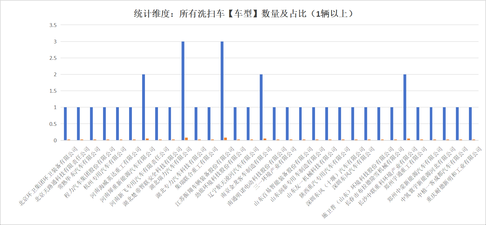 本次公告中的39款洗掃車的生產(chǎn)企業(yè)共有32家,河南海威英達(dá)重工有限公司(1輛)、河南犀重新能源汽車有限公司(2輛)、河南新飛專用汽車有限責(zé)任公司(1輛)、湖北楚帝智聯(lián)安全科技有限公司(1輛)、湖北瑞力汽車有限公司(3輛)、湖北專力汽車科技有限公司(1輛)、集瑞聯(lián)合重工有限公司(1輛)、江蘇振翔車輛裝備股份有限公司(3輛)、勁旅環(huán)境科技股份有限公司(1輛)、遼寧航天凌河汽車有限公司(1輛)、南京金龍客車制造有限公司(2輛)、南通明諾電動(dòng)科技股份有限公司(1輛)、三一環(huán)境產(chǎn)業(yè)有限公司(1輛)、山東百易智能裝備股份有限公司(1輛)、山東潤(rùn)泰專用車制造有限公司(1輛)、山東友一機(jī)械科技有限公司(1輛)、陜西重汽專用汽車有限公司(1輛)、深圳東風(fēng)(十堰)汽車有限公司(1輛)、深圳東風(fēng)汽車有限公司(1輛)、施衛(wèi)普(山東)環(huán)境科技股份有限公司(1輛)、長(zhǎng)春市布拉德除雪機(jī)械有限公司(1輛)、長(zhǎng)沙中聯(lián)重科環(huán)境產(chǎn)業(yè)有限公司(2輛)、鄭州宇通重工有限公司(1輛)、鄭州中滎新能源汽車有限公司(1輛)、中氫寰宇新能源河北有限公司(1輛)、中植一客成都汽車有限公司(1輛)、重慶耐德新明和工業(yè)有限公司(1輛)。