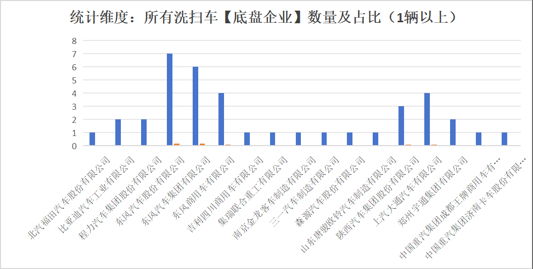 本次公告中的39款洗掃車的底盤生產(chǎn)企業(yè)共有17家,北汽福田汽車股份有限公司(1輛,占比2.6%)、比亞迪汽車工業(yè)有限公司(2輛,占比5.1%)、程力汽車集團(tuán)股份有限公司(2輛,占比5.1%)、東風(fēng)汽車股份有限公司(7輛,占比17.9%)東風(fēng)汽車集團(tuán)有限公司(6輛,占比15.4%)、東風(fēng)商用車有限公司(4輛,占比10.3%)、吉利四川商用車有限公司(1輛,占比2.6%)、集瑞聯(lián)合重工有限公司(1輛,占比2.6%)、南京金龍客車制造有限公司(1輛,占比2.6%)、三一汽車制造有限公司(1輛,占比2.6%)、森源汽車股份有限公司(1輛,占比2.6%)、山東唐駿歐鈴汽車制造有限公司(1輛,占比2.6%)、陜西汽車集團(tuán)股份有限公司(3輛,占比7.7%)、上汽大通汽車有限公司(4輛,占比10.3%)、鄭州宇通集團(tuán)有限公司(2輛,占比5.1%)、中國(guó)重汽集團(tuán)成都王牌商用車有限公司(1輛,占比2.6%)、中國(guó)重汽集團(tuán)濟(jì)南卡車股份有限公司(1輛,占比2.6%)。本次公告中的39款洗掃車中,均采用二類底盤。