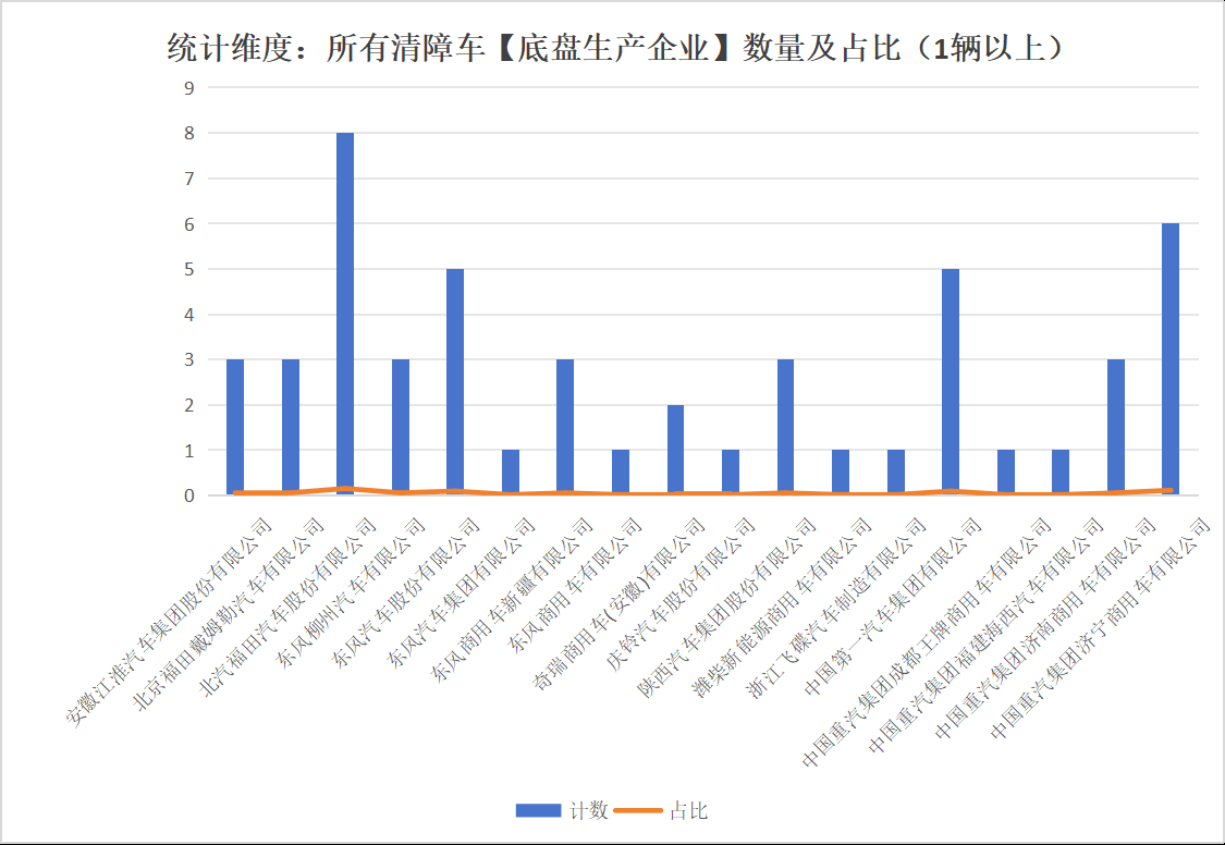 本次公告中的51款清障車的底盤生產(chǎn)企業(yè)共有18家,安徽江淮汽車集團股份有限公司(3輛)、北京福田戴姆勒汽車有限公司(3輛)、北汽福田汽車股份有限公司(8輛)、東風柳州汽車有限公司(3輛)東風汽車股份有限公司(5輛)、東風汽車集團有限公司(1輛、東風商用車新疆有限公司(3輛)、東風商用車有限公司(1輛)、奇瑞商用車(安徽)有限公司(2輛)、慶鈴汽車股份有限公司(1輛)、陜西汽車集團股份有限公司(3輛)、濰柴新能源商用車有限公司(1輛)、浙江飛碟汽車制造有限公司(1輛)、中國第一汽車集團有限公司(5輛)、中國重汽集團成都王牌商用車有限公司(1輛)、中國重汽集團福建海西汽車有限公司(1輛)、中國重汽集團濟南商用車有限公司(3輛)、中國重汽集團濟寧商用車有限公司(6輛)。本次公告中的51款清障車中,均采用二類底盤。