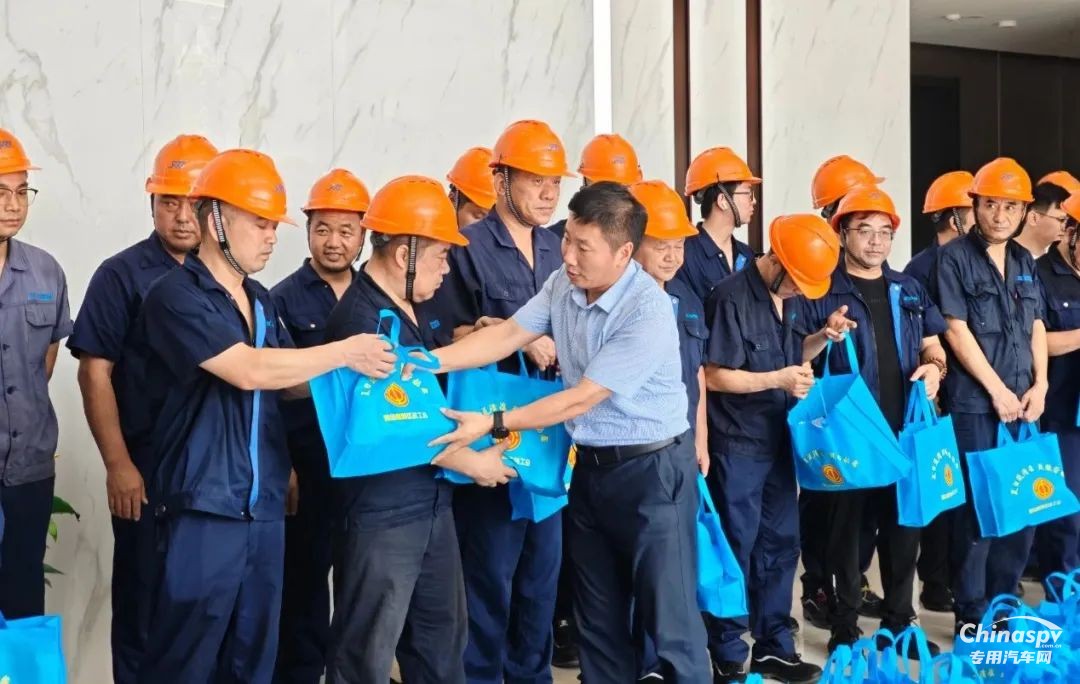 慰問(wèn)現(xiàn)場(chǎng),新站高新區(qū)總工會(huì)副主席梁華友、勁旅環(huán)境黨委書(shū)記王能元、工會(huì)主席謝思香親手將滿載關(guān)愛(ài)的清涼禮包遞到員工代表手中,每一份物資都凝聚著工會(huì)組織對(duì)一線勞動(dòng)者的敬意與牽掛。梁副主席與大家親切交談,反復(fù)叮囑:“大家守護(hù)城市潔凈非常辛苦,天氣炎熱,務(wù)必注意勞逸結(jié)合,安全第一!”