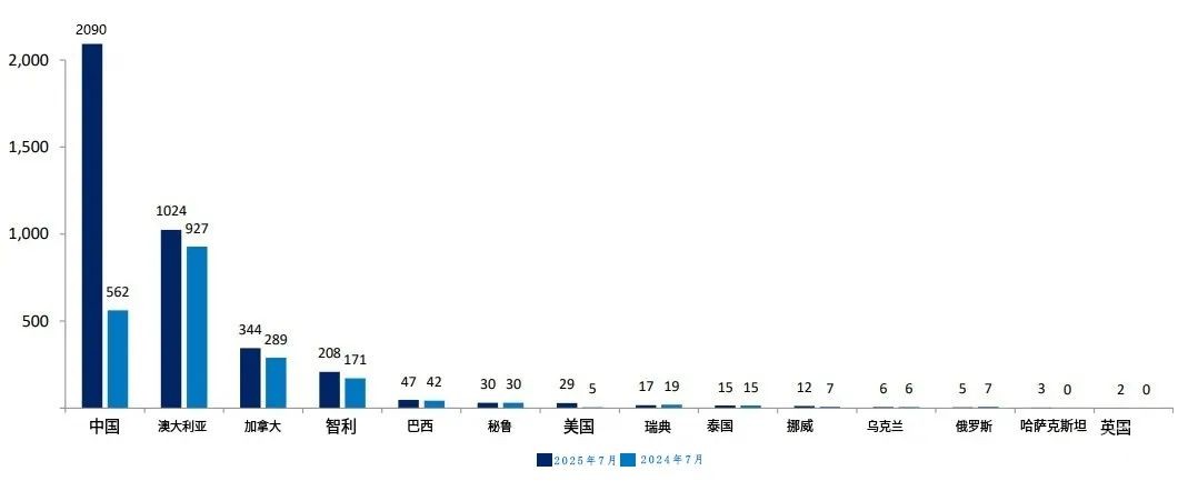 2025 年 7 月與 2024 年 7 月各國自動駕駛礦用卡車數(shù)量對比