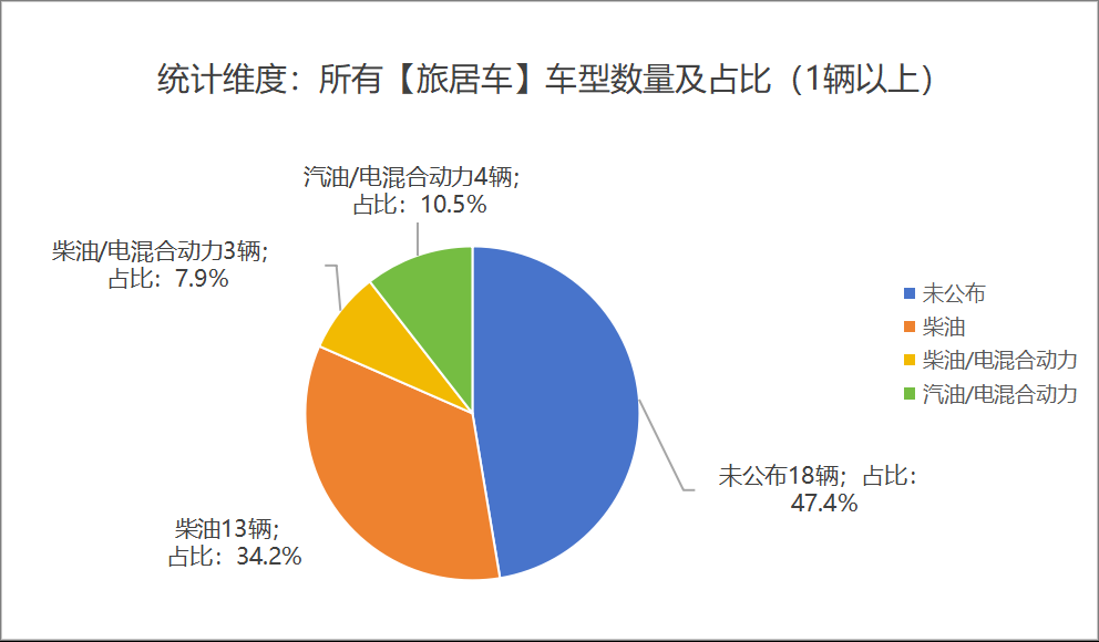 本次公告中的38款旅居車中,柴油(13輛,占比34.2%)、汽油/電混合動(dòng)力(4輛,占比10.5%)、柴油/電混合動(dòng)力(3輛,占比7.9%)、未公布相關(guān)數(shù)據(jù)(18輛,占比47.4%)。