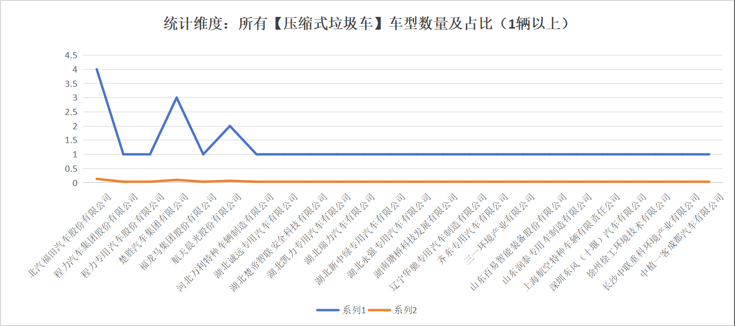 未公布數(shù)據(jù)的垃圾車企業(yè)以及數(shù)量如下:北汽福田汽車股份有限公司(3輛)、程力專用汽車股份有限公司(1輛)、楚勝汽車集團有限公司(1輛)、福龍馬集團股份有限公司(1輛)、航天晨光股份有限公司(1輛)、河北萬利特種車輛制造有限公司(1輛)、湖北楚帝智聯(lián)安全科技有限公司(1輛)、湖北新中綠專用汽車有限公司(1輛)、湖北永強專用汽車有限公司(1輛)、湖南瑭橋科技發(fā)展有限公司(1輛)、遼寧華馳專用汽車制造有限公司(1輛)、三一環(huán)境產(chǎn)業(yè)有限公司(1輛)、山東潤泰專用車制造有限公司(1輛)、上海航空特種車輛有限責任公司(1輛)、徐州徐工環(huán)境技術(shù)有限公司(1輛)、長沙中聯(lián)重科環(huán)境產(chǎn)業(yè)有限公司(1輛)、中植一客成都汽車有限公司(1輛)。