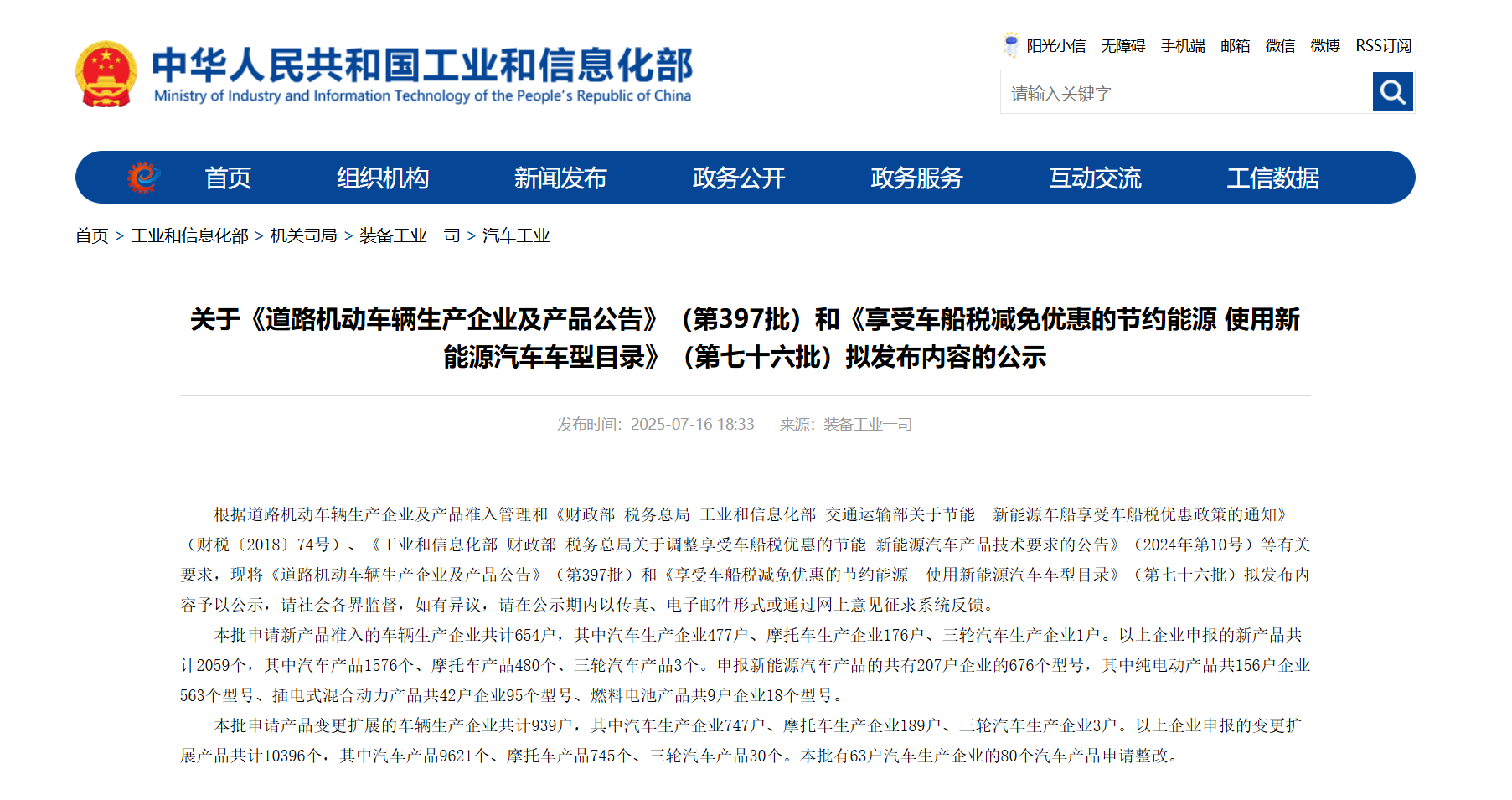 2025年,工業(yè)和信息化部第397批《道路機動車輛生產(chǎn)企業(yè)及產(chǎn)品公告》(下稱《公告》),在官方網(wǎng)站正式公示。本批申請新產(chǎn)品準入的車輛生產(chǎn)企業(yè)共計654戶,其中汽車生產(chǎn)企業(yè)477戶、摩托車生產(chǎn)企業(yè)176戶、三輪汽車生產(chǎn)企業(yè)1戶。以上企業(yè)申報的新產(chǎn)品共計2059個,其中汽車產(chǎn)品1576個、摩托車產(chǎn)品480個、三輪汽車產(chǎn)品3個。申報新能源汽車產(chǎn)品的共有207戶企業(yè)的676個型號,其中純電動產(chǎn)品共156戶企業(yè)563個型號、插電式混合動力產(chǎn)品共42戶企業(yè)95個型號、燃料電池產(chǎn)品共9戶企業(yè)18個型號。