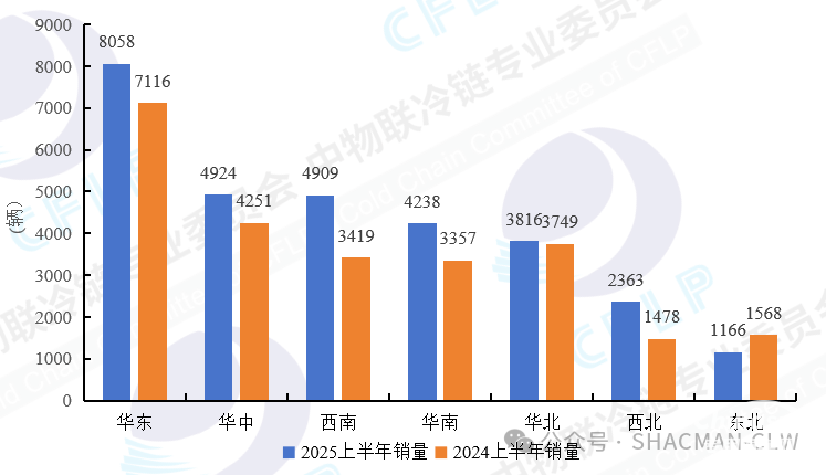 華東地區(qū)以 8,058 輛銷量穩(wěn)居榜首,占全國市場 27.34%,長三角生鮮供應(yīng)鏈一體化建設(shè)與醫(yī)藥冷鏈需求旺盛是主要驅(qū)動力。值得關(guān)注的是西北、西南地區(qū)同比分別增長 59.88% 和 43.58%,新疆果蔬產(chǎn)季(哈密瓜、葡萄外運量 + 40%)、西南農(nóng)產(chǎn)品外銷(云南鮮花冷鏈運輸量 + 35%)疊加新能源政策傾斜(如重慶對新能源冷藏車給予通行補貼),推動區(qū)域市場快速擴容。東北地區(qū)受中長途干線需求萎縮(重卡銷量 - 25.64%)及新能源滲透率不足(僅占 5%)影響,整體銷量下滑明顯。