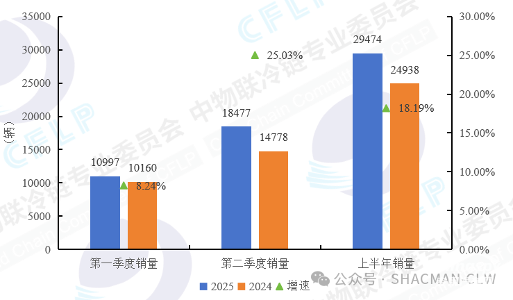 中物聯(lián)冷鏈委最新發(fā)布的《2025 上半年冷藏車市場分析報告》顯示,上半年冷藏車市場延續(xù)高景氣度,總銷量達 29,474 輛,同比增幅 18.19%。其中 Q2 銷量 18,477 輛,同比增速攀升至 25.03%,主要受益于生鮮電商滲透率提升(預(yù)計 2025 年達 18%)、連鎖餐飲供應(yīng)鏈升級(門店數(shù)量同比 + 12%)以及醫(yī)藥冷鏈需求爆發(fā)(疫苗運輸量增長 35%)。新能源冷藏車表現(xiàn)尤為突出,銷量 10,548 輛,同比激增 119.61%,滲透率突破 35.8%,較去年同期提升 16.5 個百分點,成為拉動行業(yè)增長的核心引擎。