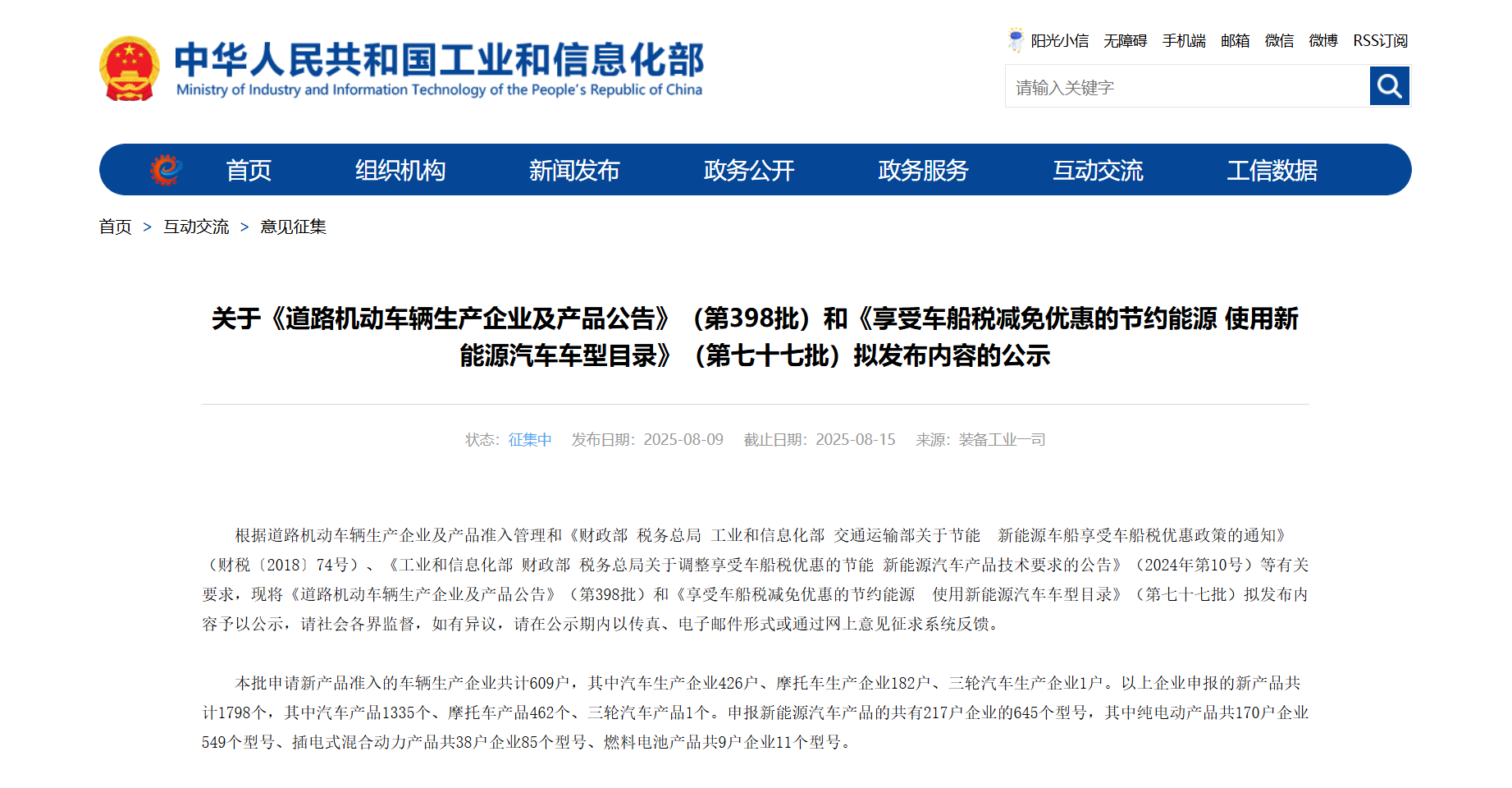 (財(cái)稅〔2018〕74號)、《工業(yè)和信息化部財(cái)政部稅務(wù)總局關(guān)于調(diào)整享受車船稅優(yōu)惠的節(jié)能新能源汽車產(chǎn)品技術(shù)要求的公告》(2024年第10號)等有關(guān) 要求,現(xiàn)將《道路機(jī)動(dòng)車輛生產(chǎn)企業(yè)及產(chǎn)品公告》(第398批)和《享受車船稅減免優(yōu)惠的節(jié)約能源 使用新能源汽車車型目錄》(第七十七批)擬發(fā)布內(nèi) 容予以公示,請社會(huì)各界監(jiān)督,如有異議,請?jiān)诠酒趦?nèi)以傳真、電子郵件形式或通過網(wǎng)上意見征求系統(tǒng)反饋。