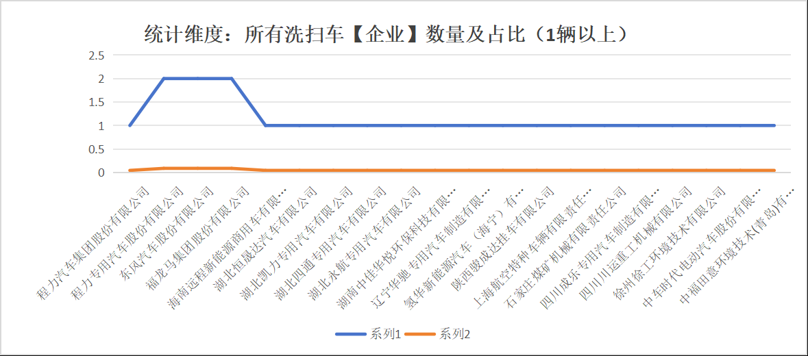 采用純電動(dòng)的洗掃車生產(chǎn)企業(yè)以及數(shù)量如下:福龍馬集團(tuán)股份有限公司(2輛)、程力專用汽車股份有限公司(2輛)、東風(fēng)汽車股份有限公司(2輛)、氫華新能源汽車(海寧)有限公司(1輛)、遼寧華馳專用汽車制造有限公司(1輛)、石家莊煤礦機(jī)械有限責(zé)任公司(1輛)、湖北凱力專用汽車有限公司(1輛)、海南遠(yuǎn)程新能源商用車有限公司(1輛)、四川成樂專用汽車制造有限公司(1輛)、四川川運(yùn)重工機(jī)械有限公司(1輛)、湖北四通專用汽車有限公司(1輛)、程力汽車集團(tuán)股份有限公司(1輛)、徐州徐工環(huán)境技術(shù)有限公司(1輛)、中車時(shí)代電動(dòng)汽車股份有限公司(1輛)、湖北恒晟達(dá)汽車有限公司(1輛)、上海航空特種車輛有限責(zé)任公司(1輛)。
