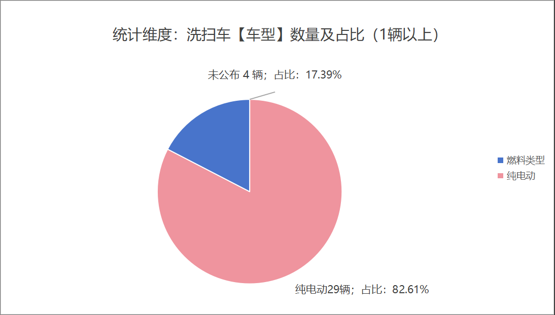 本次公告中的23款洗掃車中,采用純電動(dòng)能源(19輛,占比82.61%)、未公布能源情況(4輛,占比17.39%)。
