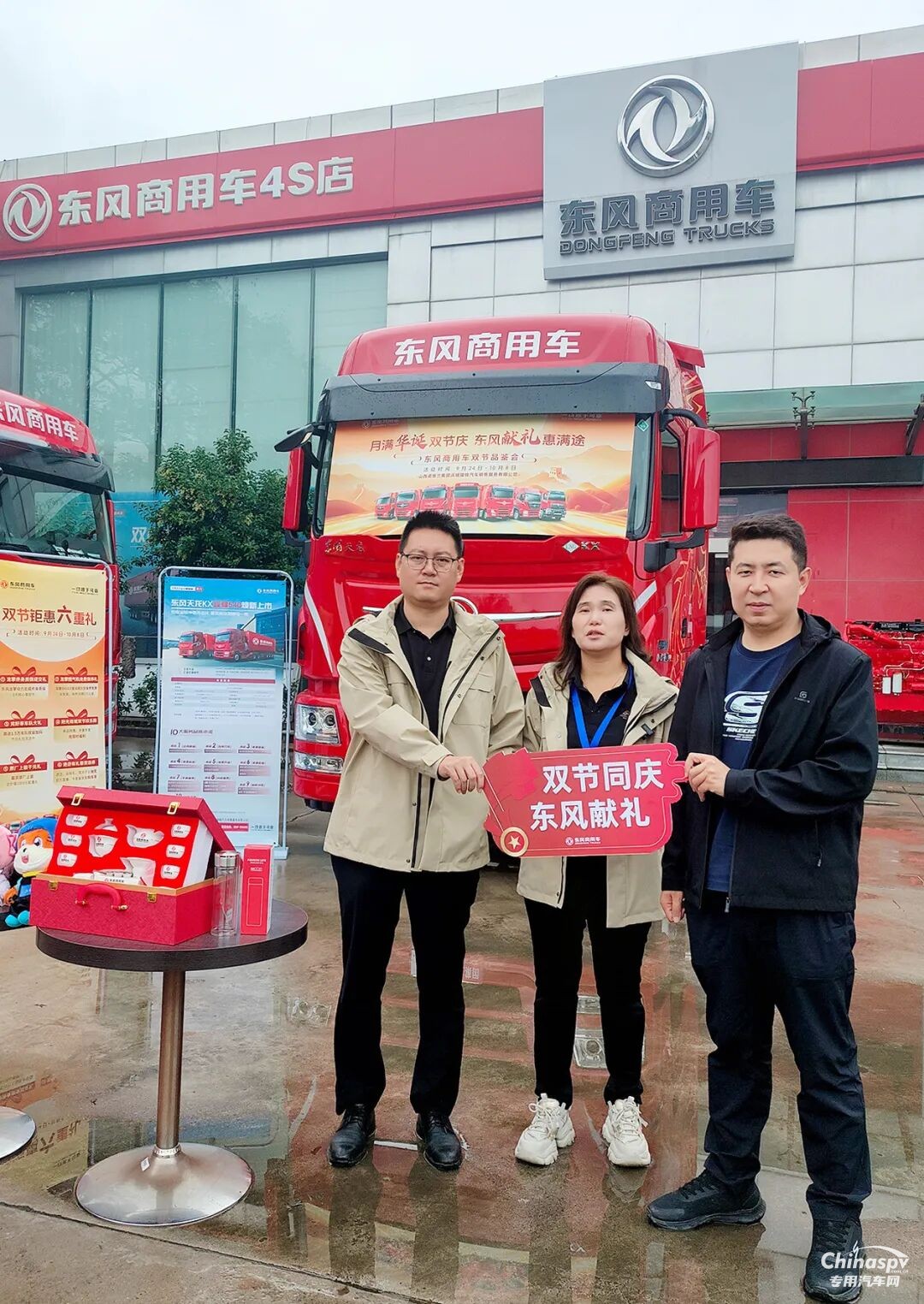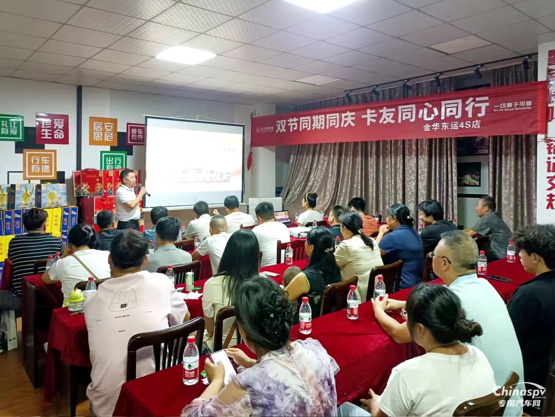 協(xié)同金華東運(yùn)4S店開(kāi)展“月滿華誕雙節(jié)慶 東風(fēng)獻(xiàn)禮惠滿途”活動(dòng)?,F(xiàn)場(chǎng)布置喜慶,眾人齊聚,圍繞著醒目的紅色橫幅合影,周邊還有禮品陳列,營(yíng)造出熱烈的氛圍。此次活動(dòng)既借助雙節(jié)熱度為客戶帶來(lái)購(gòu)車優(yōu)惠,也展現(xiàn)出東風(fēng)卡車的品牌魅力,客戶開(kāi)啟高效運(yùn)輸新體驗(yàn)。