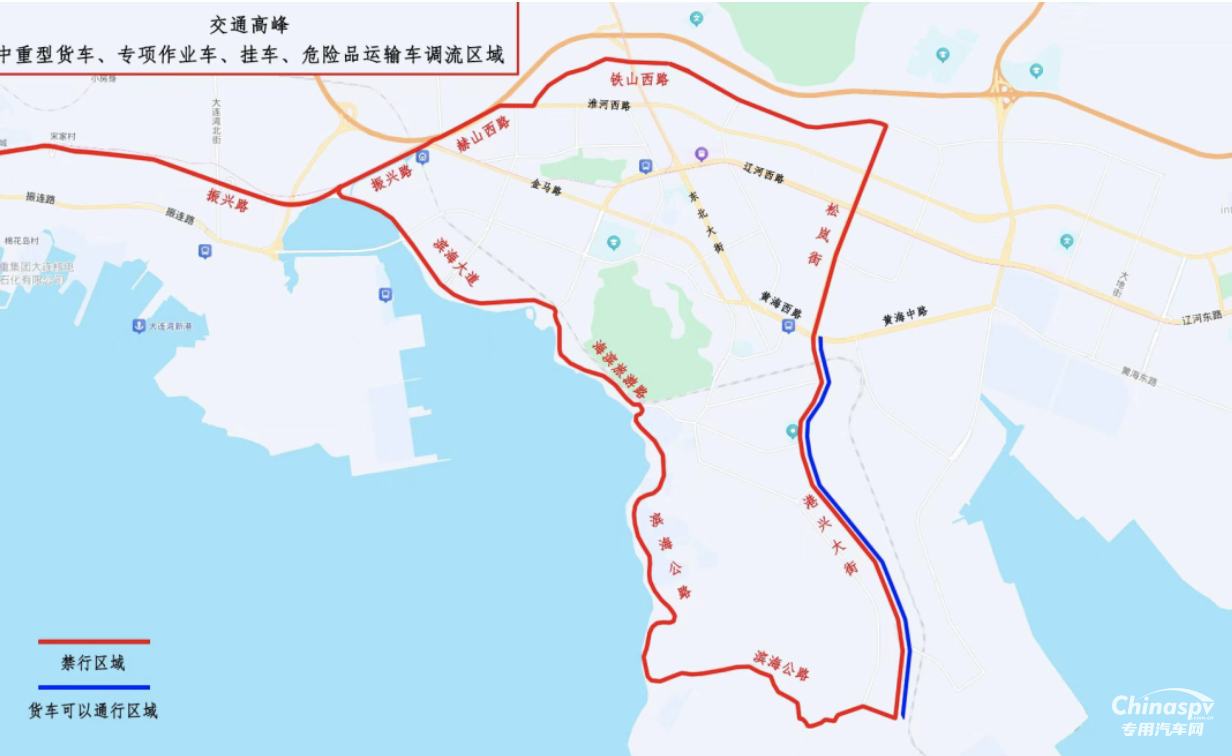 一、每日6時30分至8時30分、16時30分至18時30分,禁止中、重型載貨汽車(不含中型廂式貨車)、專項作業(yè)車以及危險品運輸車在金普新區(qū)的振興路、赫山西路、鐵山西路、松嵐街、港興大街、濱海公路、海濱旅游路、濱海大道的圍合區(qū)域及上述除港興大街以外道路通行。