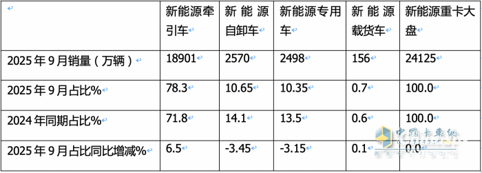 表2,根據(jù)終端上牌數(shù)據(jù),2025年9月新能源重卡各細分市場銷量、占比及占比同比增減: