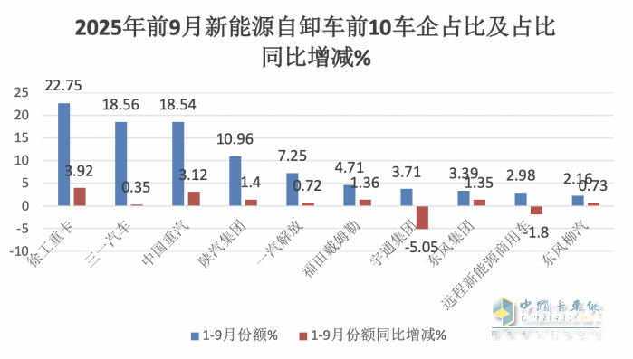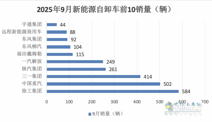 上圖表可見,在2025年9月新能源自卸車市場中: