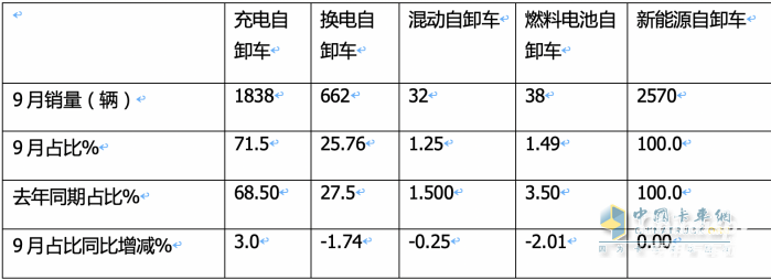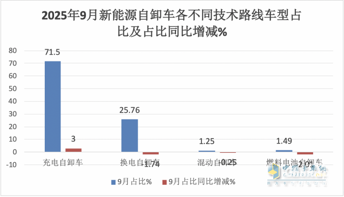 上圖表顯示,按技術(shù)路線劃分,在2025年9月各動力新能源自卸車銷量中: