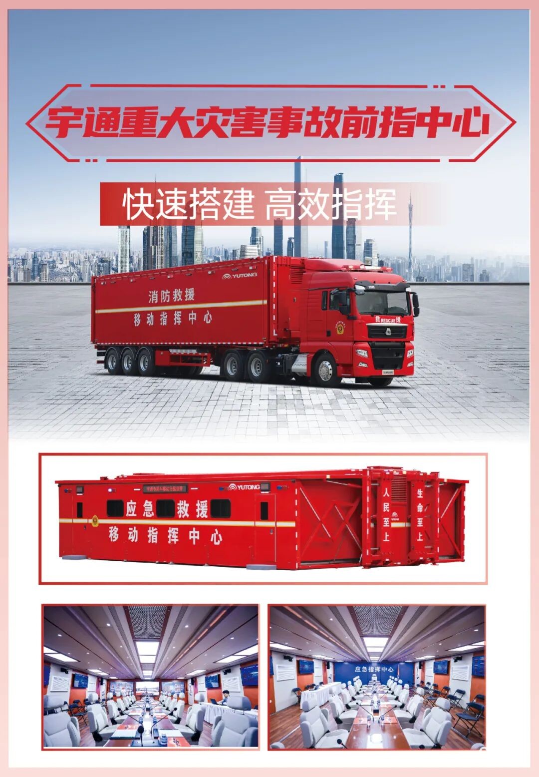 宇通重大災(zāi)害事故前指中心,是一線指揮、決策、調(diào)度的“大腦”。集視頻會(huì)議、顯示、辦公及集中控制、供配電及輔助配套模塊為一體,半個(gè)小時(shí)即可快速搭建完成,室內(nèi)面積約85㎡,可容納60~80人集中會(huì)議會(huì)商。車輛可展開收回一鍵操作、配置一體化滑動(dòng)商務(wù)椅、12P中央冷暖空調(diào)、遠(yuǎn)程通信、現(xiàn)場(chǎng)組網(wǎng)、3組98寸重型車載屏等,在重大災(zāi)害及極端條件下,能夠快速建立起應(yīng)急通信保障力量,建設(shè)完善的應(yīng)急救援指揮體系,高效指揮救援工作的有序開展。