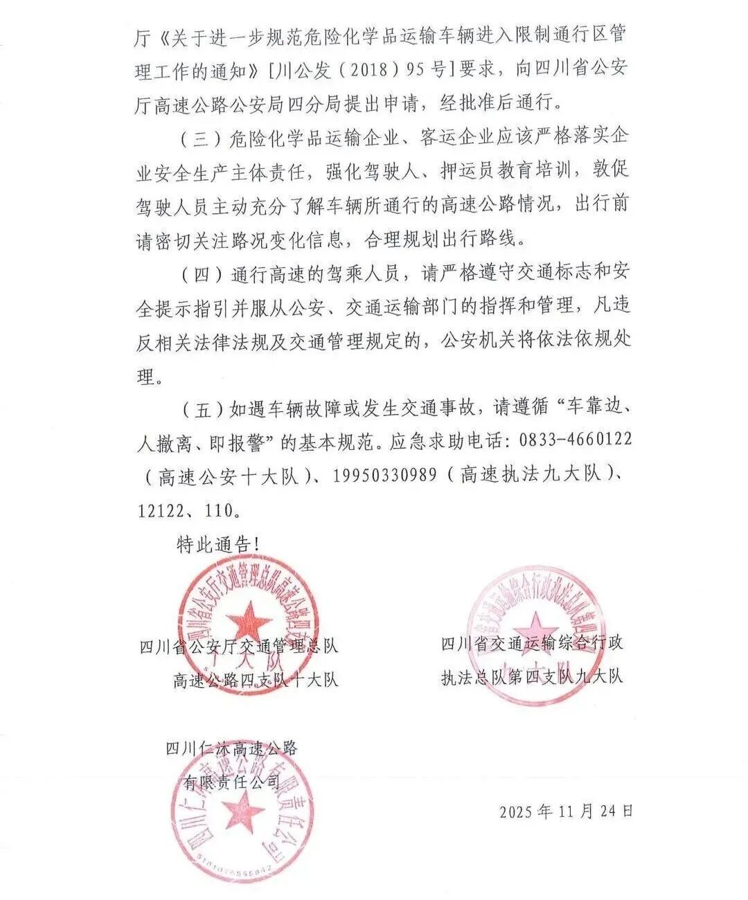 如遇車輛故障或發(fā)生交通事故,請遵循“車靠邊、人撤離、即報警”的基本規(guī)范。應急求助電話:0833-4660122(高速公安十大隊)、19950330989(高速執(zhí)法九大隊)、12122、110。