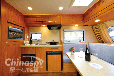 生活設施:電磁爐;進口抽油煙機;進口房車專用三能源冰箱(DC12,AC220,燃氣),水槽;