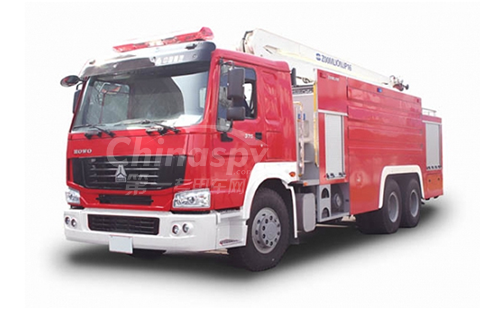 該車帶有水罐、消防泵,臂架頂端的消防炮射程遠(yuǎn),流量大,即可打直流,又可噴霧,可以在距火源較遠(yuǎn)的位置獨(dú)立完成救火作業(yè),是當(dāng)今世界上較理想的高空消防滅火裝備。
