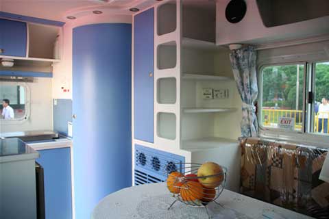 車內(nèi)空間看似狹小,但利用率高、功能齊全。配有U型沙發(fā)(可拼成1640mm×1940mm的床),衛(wèi)生間,影音系統(tǒng),燃?xì)獗?,燃?xì)馀L(fēng),燃?xì)鉄崴鳎細(xì)庠畹雀鞣N設(shè)施,還可選裝窗式駐車空調(diào)。