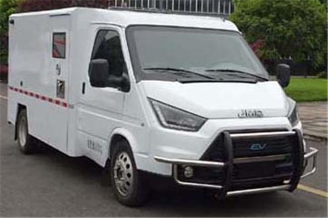 備注 選裝不同樣式前防撞保險杠及后踏步,車頂造型,后單開或后雙開門,中門鎖;選裝低頂或高頂;基準(zhǔn)車長5826mm,前懸1176mm;選裝無前防撞保險杠車長5676mm,前懸1026mm;基準(zhǔn)車車高2160mm,選裝高頂時車高2250mm,選裝低頂車高2120mm;基準(zhǔn)車整備3430kg,載質(zhì)量380kg;選裝另一種箱體內(nèi)部結(jié)構(gòu),整備3330kg,載質(zhì)量480kg;選裝3+2或2+3,對應(yīng)載質(zhì)量分別為445kg,545kg;側(cè)面和后部為客廂式裙邊結(jié)構(gòu),側(cè)面裙邊離地高350mm,后部防護(hù)材料Q235,采用焊接與車身連接.離地高415mm;ABS系統(tǒng)型號:APG 3550500G,生產(chǎn)企業(yè):浙江亞太機(jī)電股份有限公司;儲能裝置種類:鋰離子電池,儲能裝置單體生產(chǎn)企業(yè):力神動力電池系統(tǒng)有限公司,儲能裝置總成生產(chǎn)企業(yè):武漢力神動力電池系統(tǒng)科技有限公司;驅(qū)動電機(jī)類型:永磁同步電動機(jī),驅(qū)動電機(jī)型號:TZ260XSDA4,電機(jī)額定功率60KW,峰值功率120KW,生產(chǎn)廠家:廈門捷歐大地和新能源有限公司;產(chǎn)品技術(shù)階段:發(fā)展期,可在全國銷售;主要專用裝置防彈防爆運鈔艙.