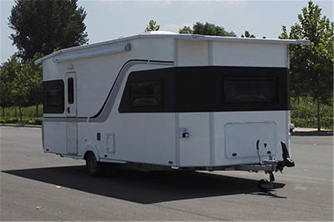 備注 該車非乘用車,行駛過程中不載人.牽引桿連接器最大負荷95kg.牽引桿深入量:50mm.選裝前、后示廓燈位置,側面窗戶、門位置,選裝側儲物倉,無后風窗,可取消后儲物倉.車廂內(nèi)部配備起居臥室、炊具、沙發(fā)桌椅、衛(wèi)生及娛樂設施等專用設備.左側選裝外置加水口,下開式倉門;后部選裝方形排煙口,外置加水口.選裝標準配置時整備質量為1350Kg,選裝中等配置時整備質量為1415Kg.
