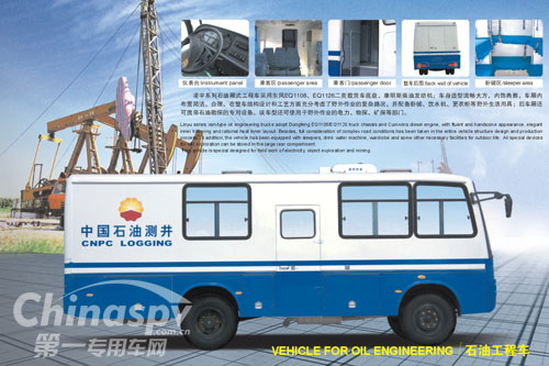凌宇系列石油廂式工程車采用東風EQ1108、EQ1126二類載貨車底盤,康明斯柴油發(fā)動機;車身造型流暢大方,內(nèi)飾典雅,車廂內(nèi)布置簡潔、合理,在整車結(jié)構(gòu)設(shè)計和工藝方面充分考慮了野外作業(yè)的復雜路況,并配備臥鋪、飲水機、更衣柜等野外生活用具;后車廂還可攜帶石油勘探的專用設(shè)備。該車型還使用于野外作業(yè)的電力、物探、礦探等用途。